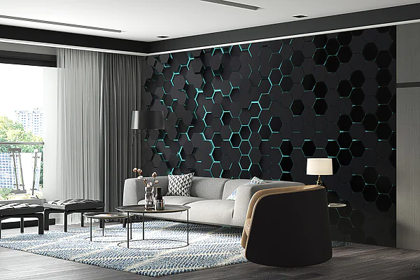 Papier peint Papier peint Hexagones noirs avec lumières bleues (UGS : u93618)