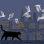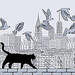 Papier peint Chat marchant sur un mur avec des oiseaux volant dans le ciel