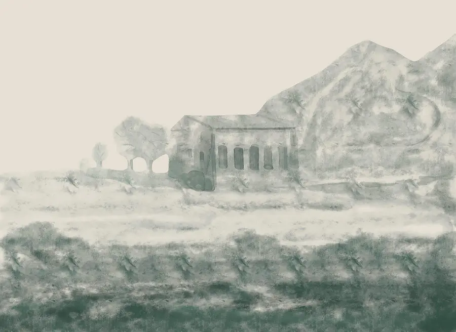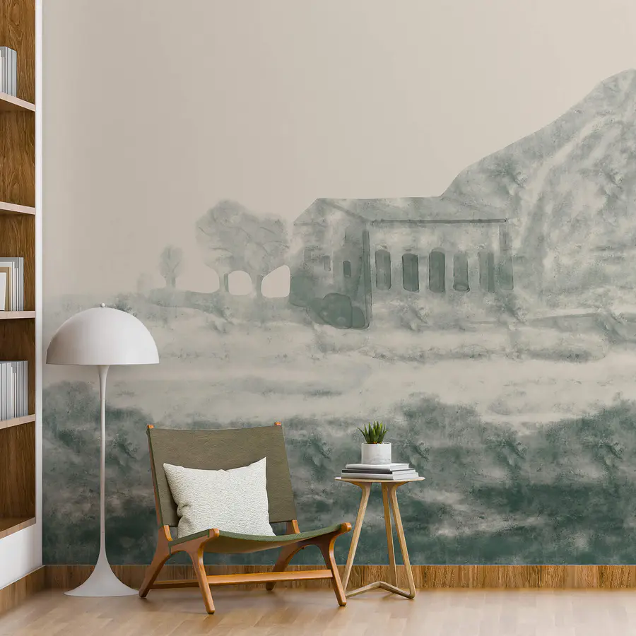 Papier peint Peinture d’un bâtiment et d’une montagne