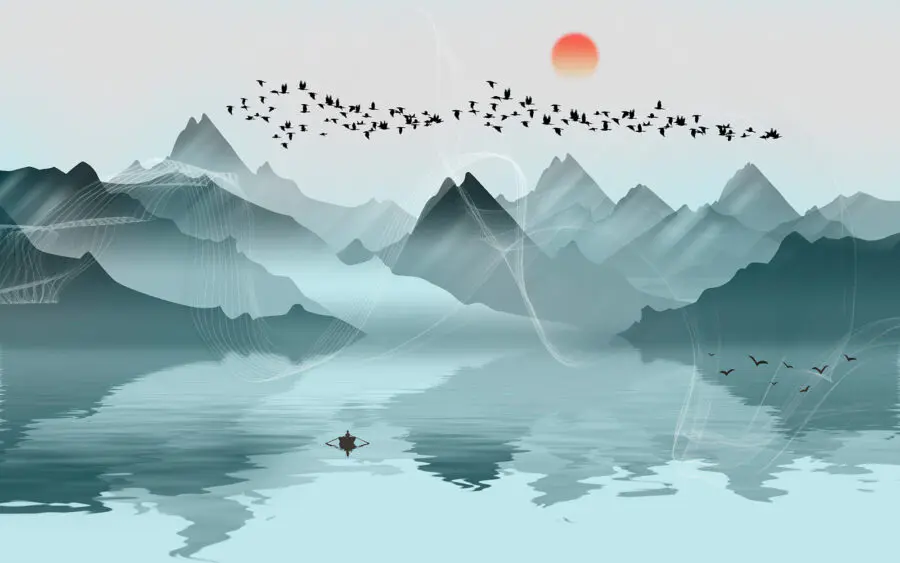 Papier peint Groupe d’oiseaux volant au-dessus d’un lac