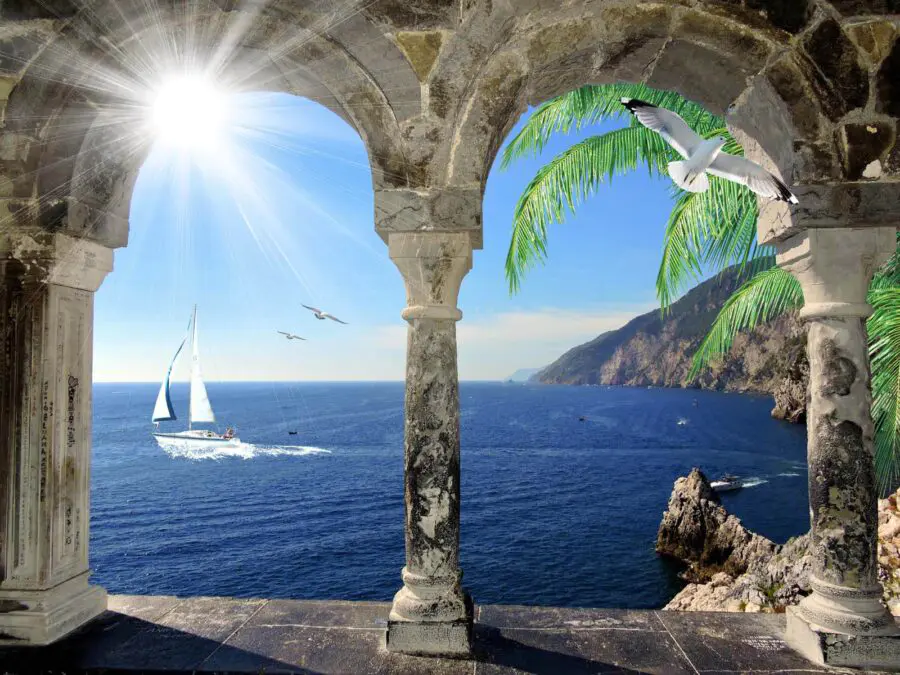 15.50 €9.30 €Papier peint Arcade en pierre avec vue sur une ville et l’eau