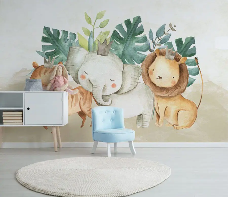 Transformez n'importe quel espace avec cette peinture murale enchanteresse représentant un ensemble royal d'animaux : un adorable éléphant, un renard effronté et un charmant lion. Chaque créature porte une petite couronne, apportant une touche de charme fantaisiste à vos murs. Imaginez que vous entrez dans votre chambre et que vous êtes accueilli par ces adorables visages, dont l'énergie enjouée illumine l'atmosphère. C'est comme si vous organisiez une petite fête de la jungle à la maison ! Parfait pour les chambres d'enfants ou tout autre endroit qui aurait besoin d'une touche de gaieté, ce motif aquarelle est une façon délicieuse de stimuler l'imagination et la créativité. Qui ne sourirait pas devant ces adorables petits rois ?