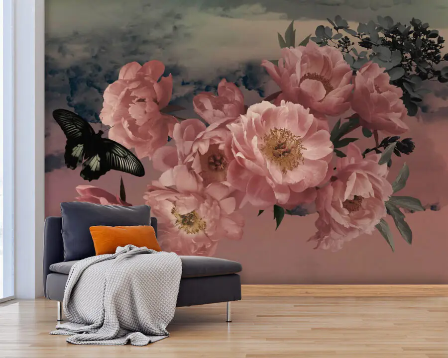 Papier peint Papillon survolant un bouquet de fleurs roses