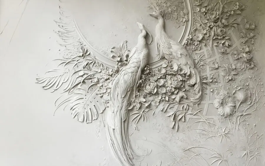 Papier peint Mur blanc avec un couple d’oiseaux et de fleurs