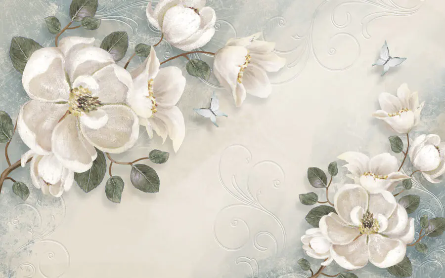 Papier peint Fleurs et feuilles blanches sur fond blanc