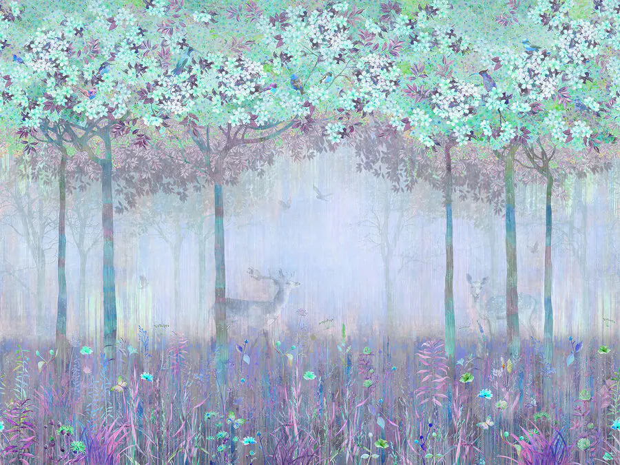 Papier peint Peinture d’une forêt avec des arbres et des fleurs
