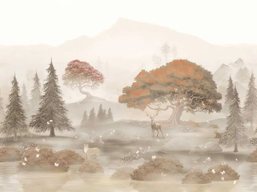 Apportez la sérénité de la nature à l'intérieur avec cette superbe fresque forestière, où se déploie une danse délicate d'arbres et de montagnes. Imaginez que vous entrez dans votre chambre et que vous êtes accueilli par le murmure des pins et les éclats des teintes automnales, invitant à un moment de calme. Imaginez les nuits passées à contempler l'œuvre d'art, à laisser votre esprit vagabonder vers des aventures en forêt ou simplement à rêvasser à propos de feux de camp chaleureux. Avec un cerf qui jette un coup d'œil curieux et un renard qui gambade à proximité, c'est comme un doux rappel de la nature sauvage qui se trouve juste derrière votre fenêtre. Parfaite pour égayer un espace de vie ou inspirer un coin lecture confortable, cette peinture murale transforme n'importe quel mur en un lieu d'évasion pittoresque. Votre maison mérite une touche d'extérieur - qui ne voudrait pas s'évader dans la nature sans spray anti-moustiques ?