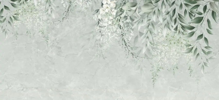Papier peint Fleurs blanches et feuilles vertes sur fond blanc