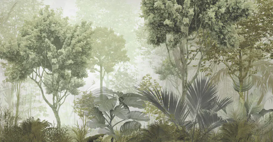 Papier peint Groupe d’arbres et de plantes dans une forêt brumeuse