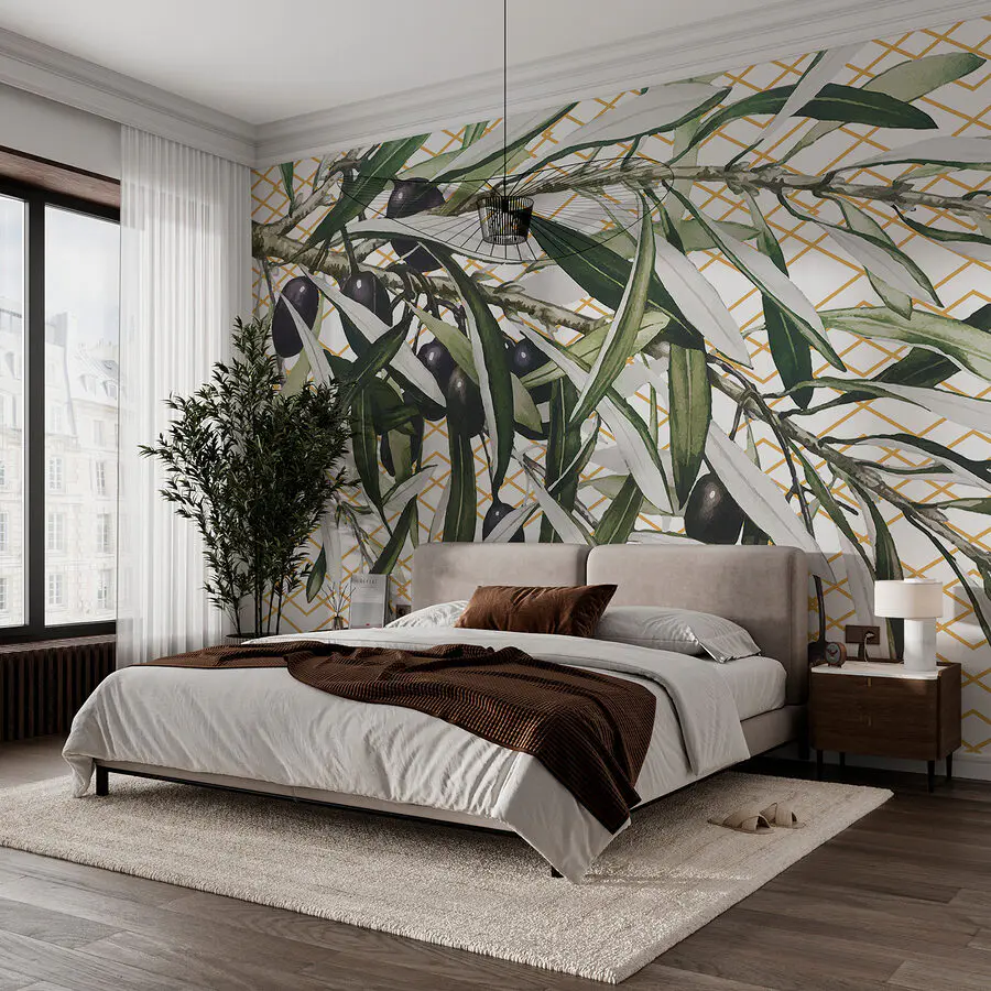 Papier peint Une branche avec des olives noires et des feuilles