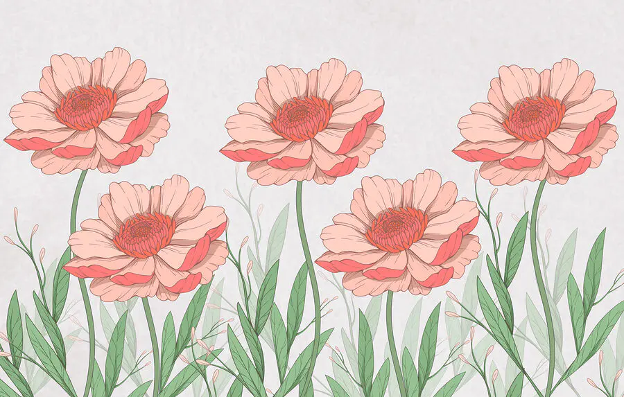 Papier peint Groupe de fleurs roses avec feuilles vertes