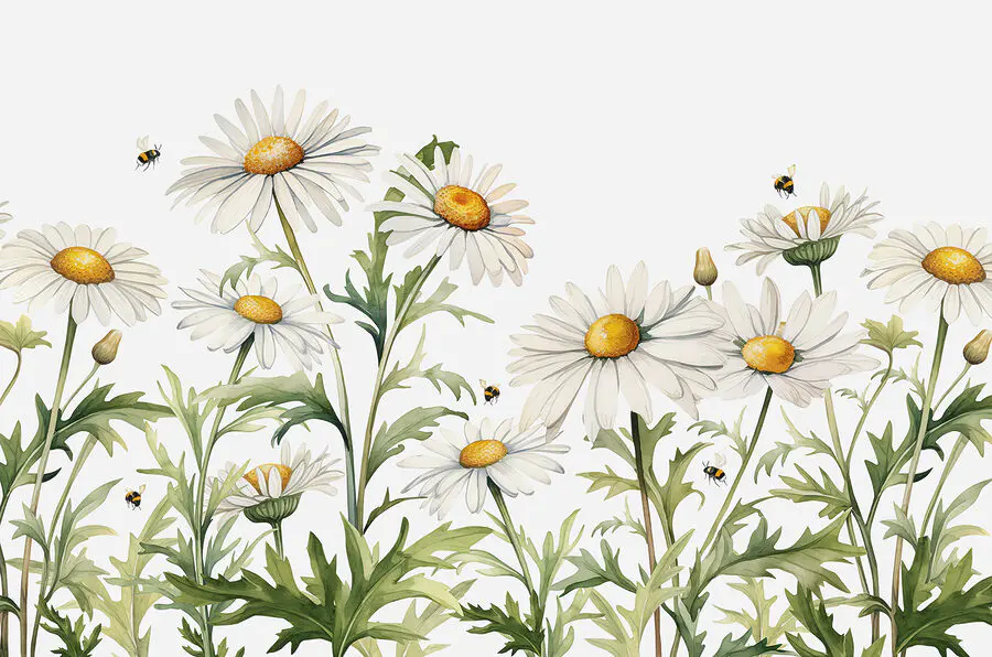 Papier peint Groupe de fleurs blanches à centre jaune et feuilles vertes
