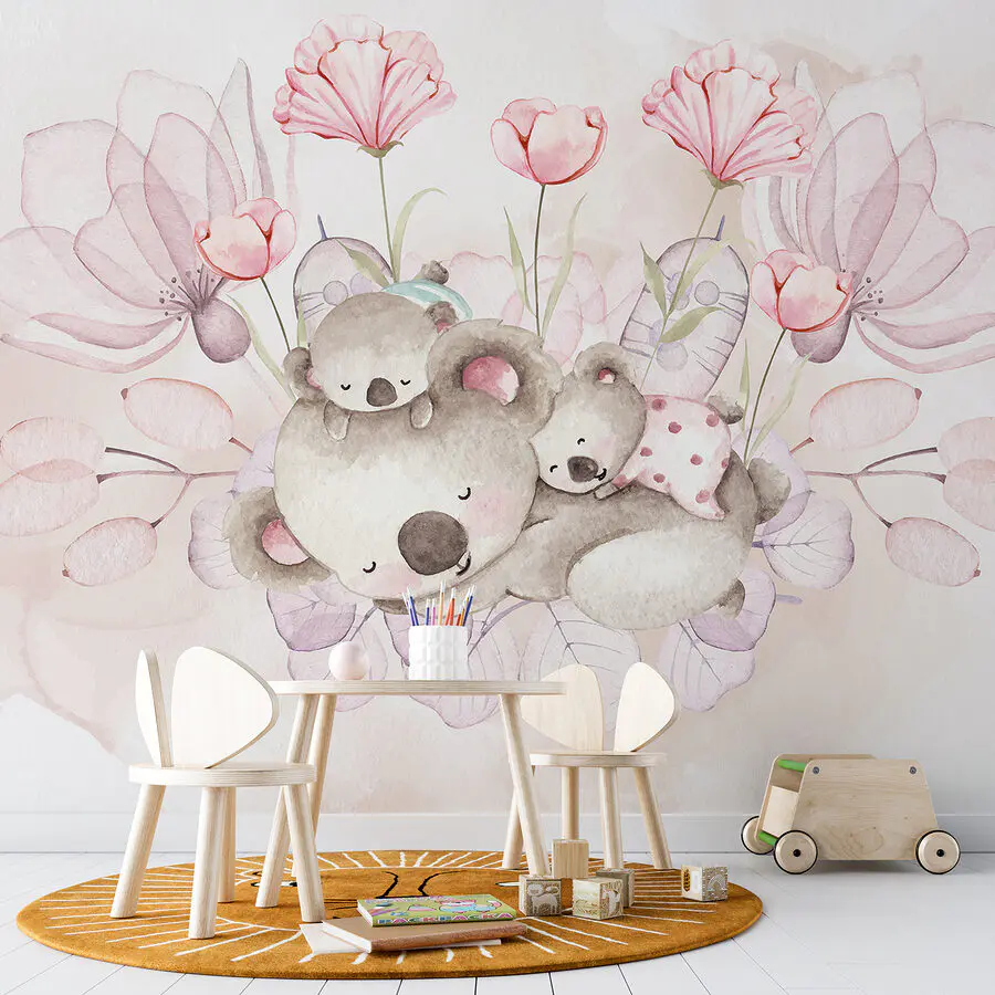 Papier peint Illustration à l’aquarelle d’un couple de koalas et de fleurs