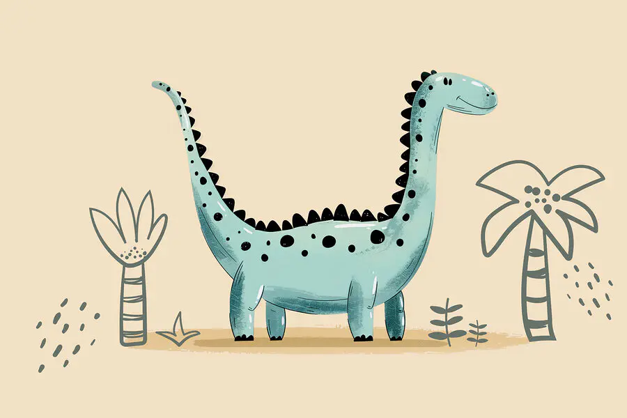 Papier peint Dinosaure de dessin animé avec des plantes et des feuilles