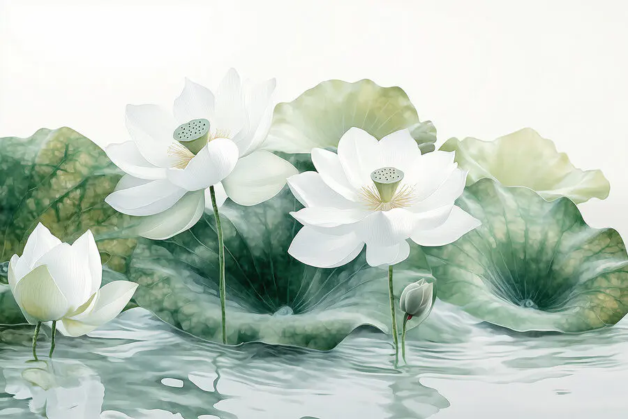 Papier peint Groupe de fleurs blanches et de feuilles vertes dans l’eau