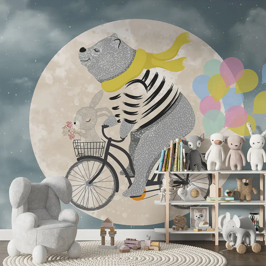 Imaginez un ours, vêtu d'une écharpe jaune, pédalant nonchalamment sur une bicyclette au milieu de nuages duveteux. Quelle fantaisie ! En ajoutant des ballons derrière lui, cette peinture murale apportera une touche de magie à n'importe quelle pièce. Elle semble tout droit sortie d'un rêve - ou peut-être d'un livre pour enfants particulièrement fantaisiste. Imaginez : vous levez les yeux de votre livre et voilà qu'un ours joyeux se promène avec un petit ami. C'est une véritable bouffée d'air frais, idéale pour tous ceux qui ont envie d'un peu de rêve dans leur décor.
