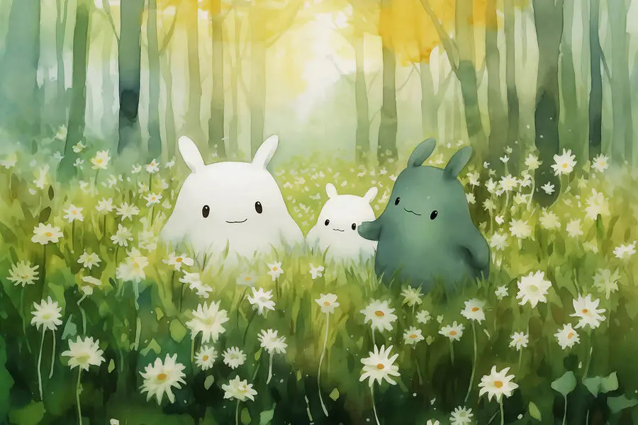 Papier peint Groupe de personnages de bandes dessinées dans un champ de fleurs