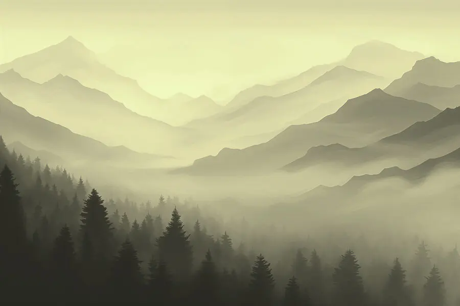 15.50 €9.30 €Papier peint Paysage de montagnes avec arbres et brouillard