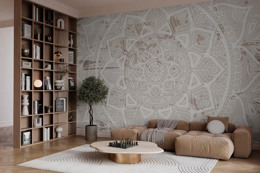 Papier peint Mandala blanc sur une surface brune