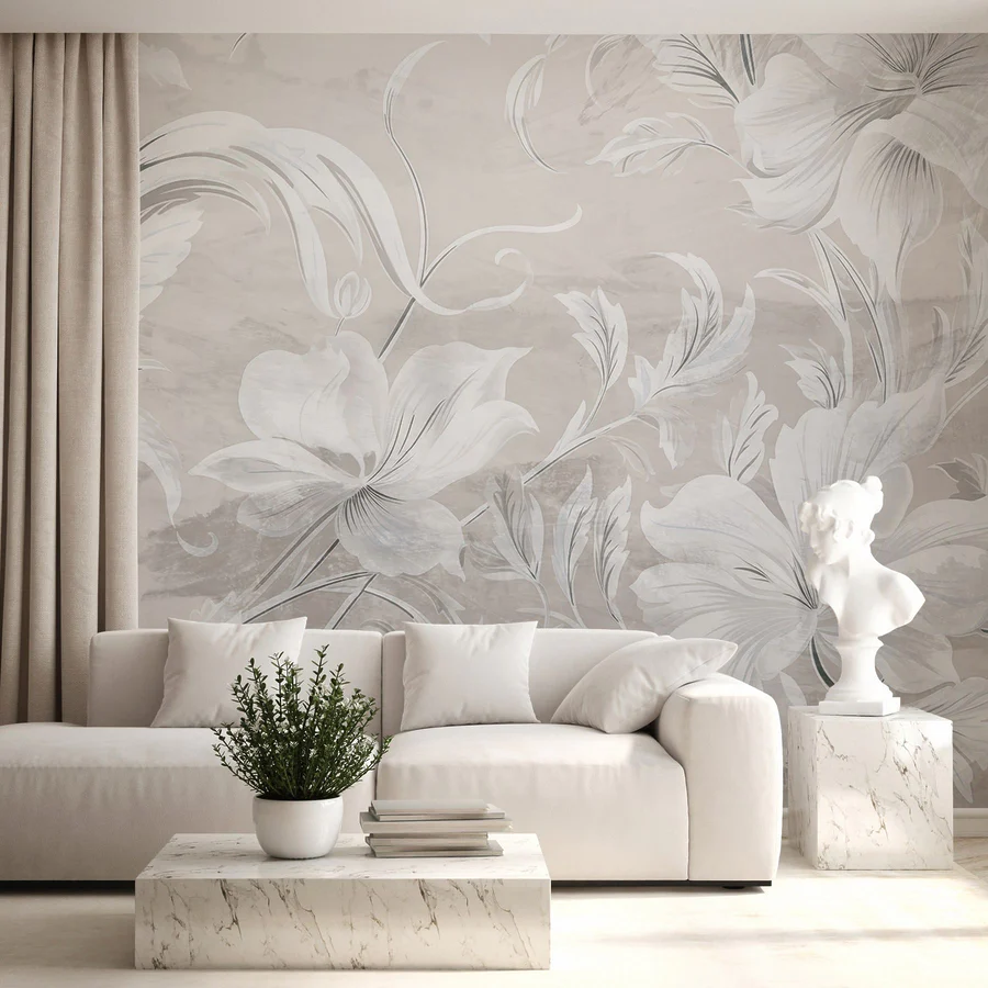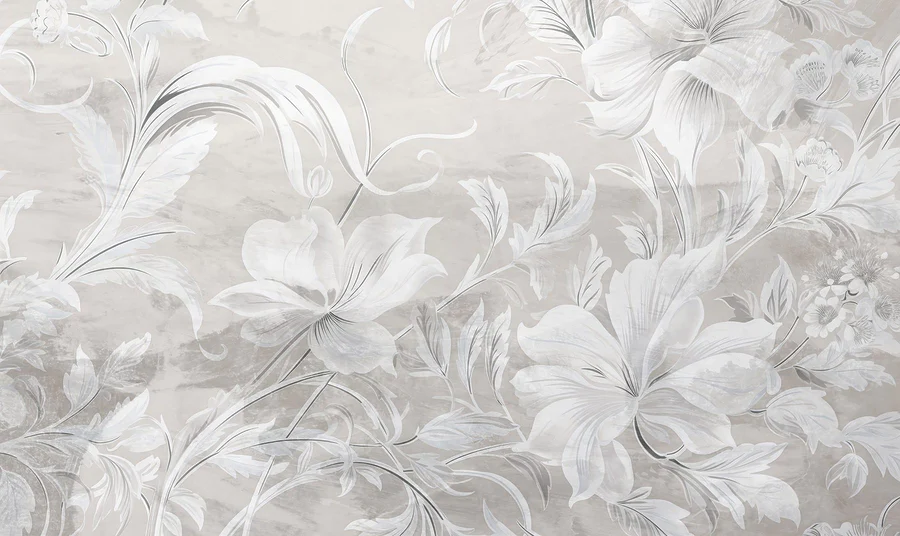 Papier peint Motif floral blanc et gris