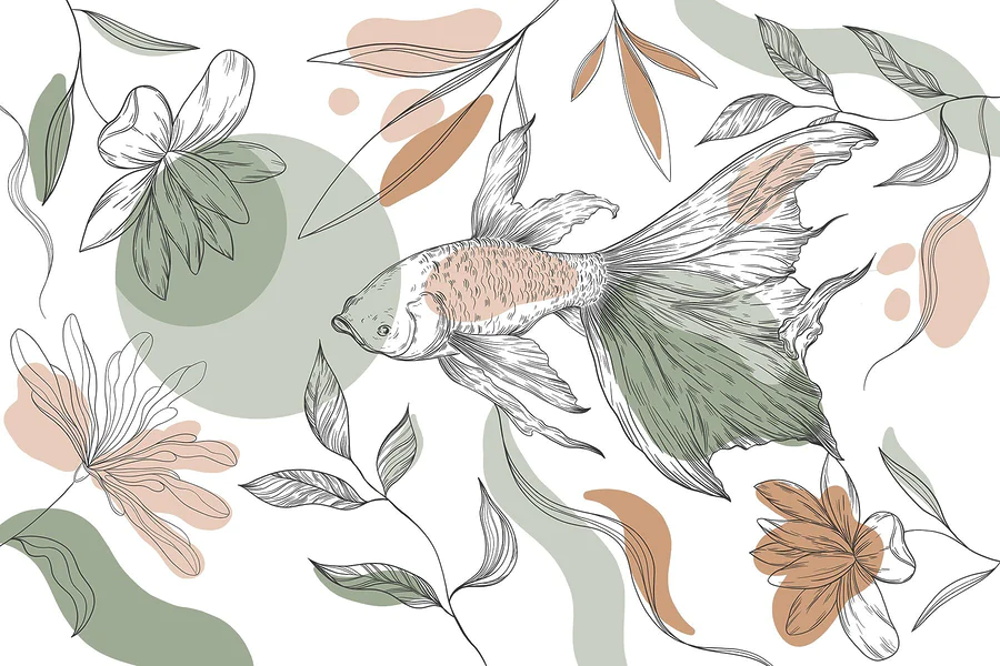Papier peint Poissons et plantes sur fond blanc