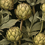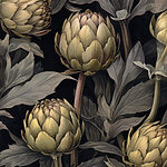Papier peint Artichauts avec feuilles et tiges sur fond noir
