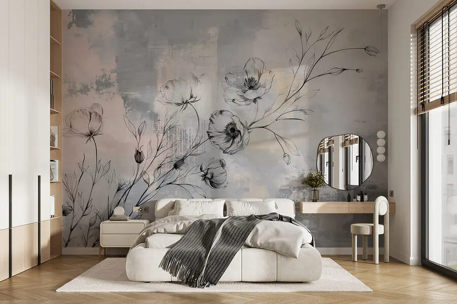 Papier peint Dessin de fleurs sur fond gris