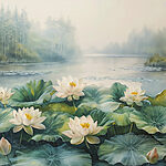 Papier peint Peinture d’un étang avec des fleurs blanches et des feuilles vertes