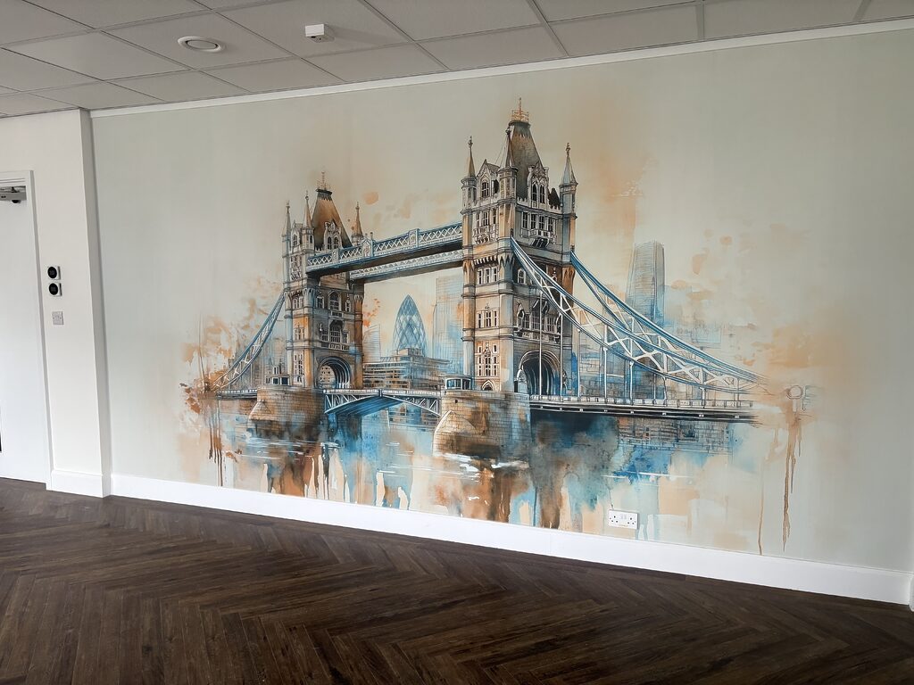 La fresque murale du pont de Londres est superbe dans notre salle de réunion.