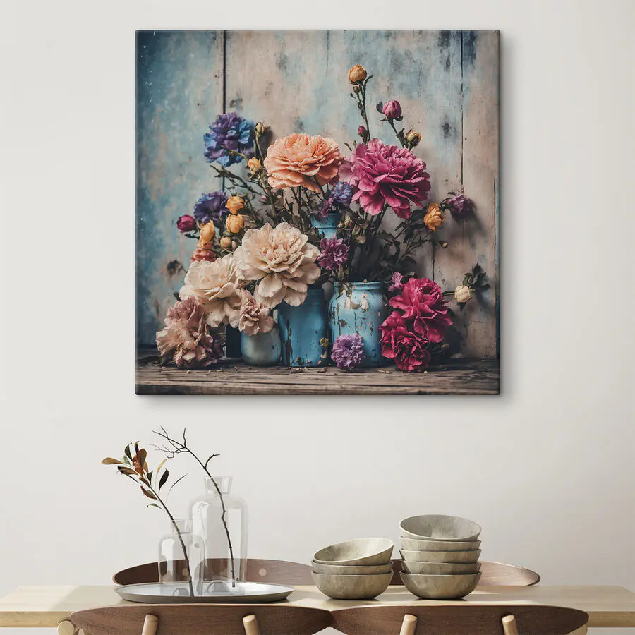 Tableaux Groupe de fleurs colorées dans des vases bleus