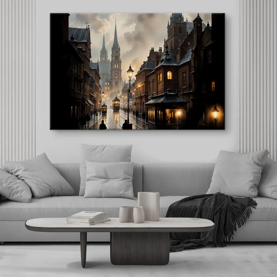 Imagine hanging "Tableaux Street with Buildings and a Train" right in your living room. It's like inviting a little slice of urban chic into your home. This print just has that vibe—where architecture meets adventure! The way the buildings tower, almost whispering stories of old, and the train chugs along like it’s got somewhere important to be. It's perfect for city lovers or anyone dreaming of bustling streets while sipping morning coffee in their pajamas. It feels like a journey that'll make any space buzz with life!