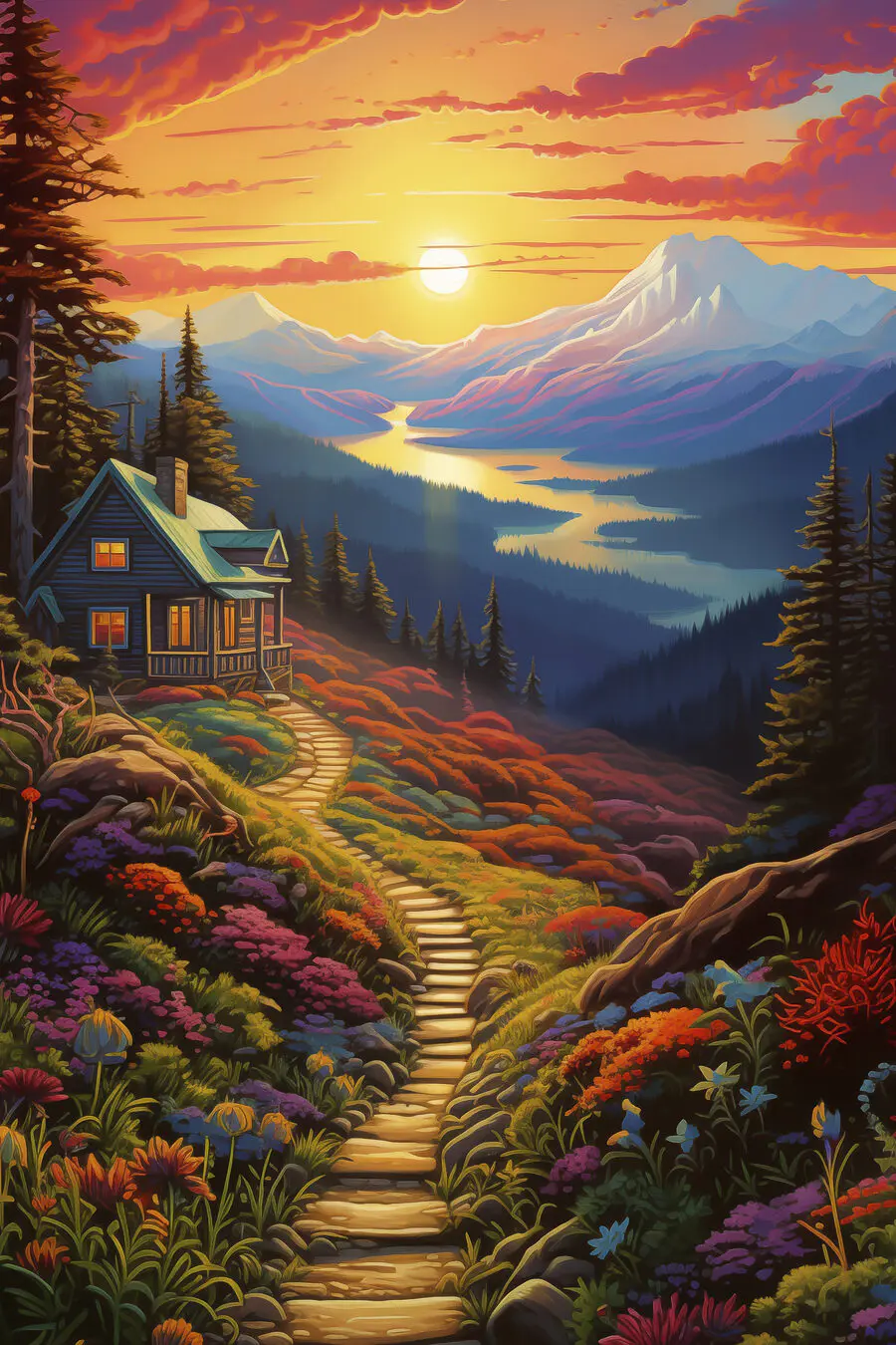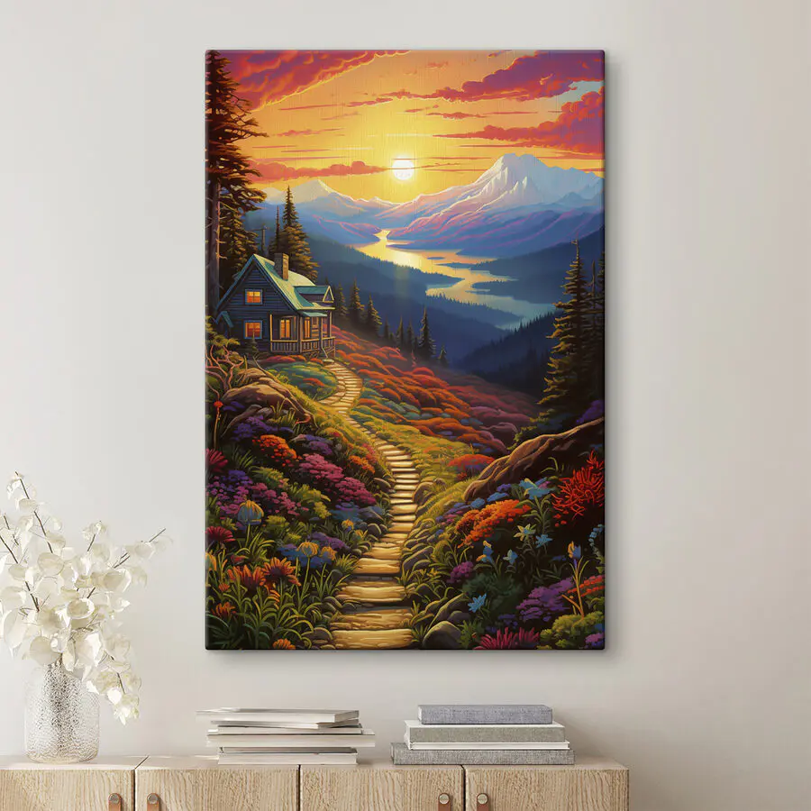 Tableaux Maison sur une colline avec un chemin menant à une vallée avec des montagnes et une rivière