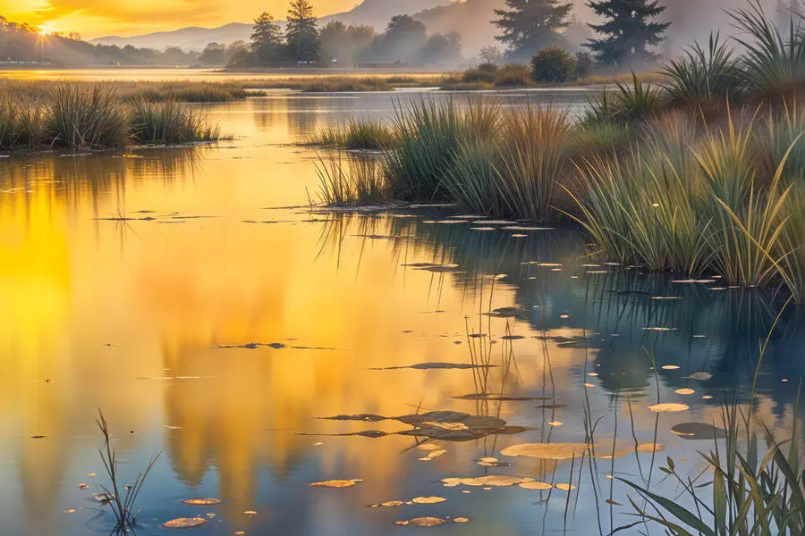 Tableaux Eau avec plantes et arbres en arrière-plan