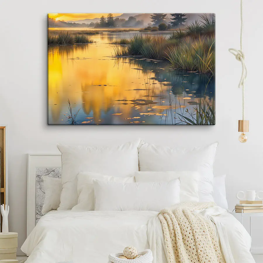 Imaginez que vous entrez dans une pièce et que vous êtes instantanément accueilli par des eaux sereines et une verdure luxuriante. Cette œuvre "Impression sur toile Eau avec plantes et arbres en arrière-plan" capture ce moment parfait, comme un après-midi paresseux passé au bord d'un lac, un soleil chaud sur le visage et une douce brise ébouriffant les feuilles. Avec des couleurs vibrantes se reflétant sur l'eau, cette œuvre nous rappelle de ralentir et d'apprécier la beauté de la nature. Parfaite pour un salon confortable ou une chambre à coucher paisible, cette toile vous donne l'impression d'être chez vous tout en invitant une part de l'extérieur à l'intérieur. C'est comme si vous aviez des mini-vacances sur votre mur - aucun plan de voyage n'est nécessaire !