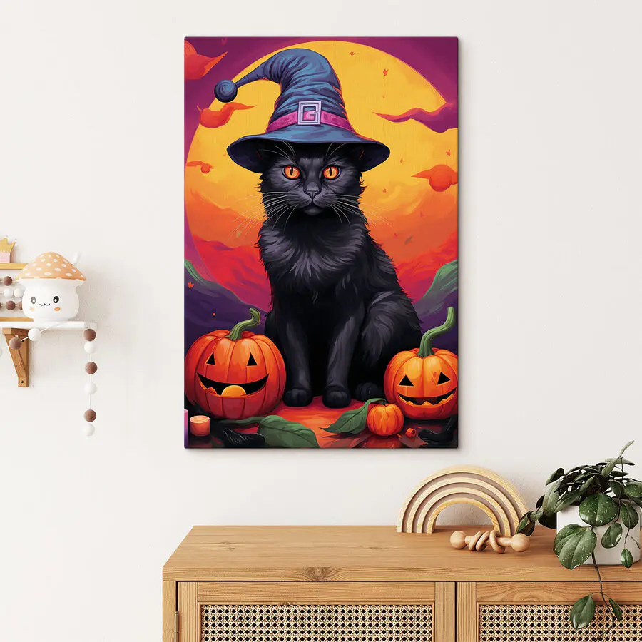 Tableaux Chat noir portant un chapeau et des citrouilles