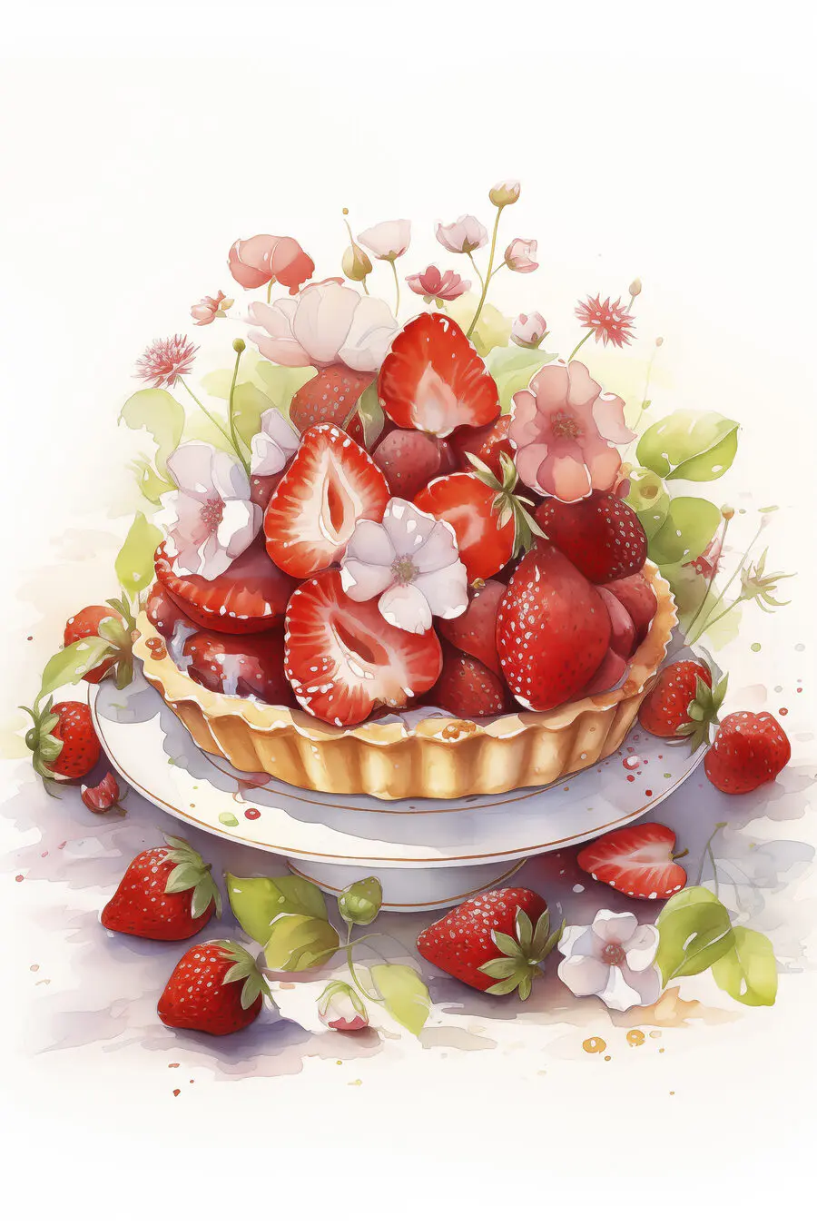 Tableaux Aquarelle d’une tarte avec des fraises et des fleurs
