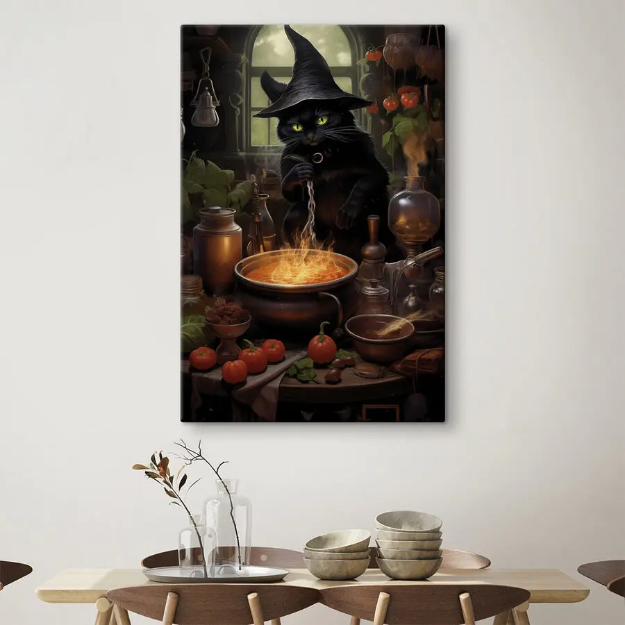 Voici la charmante impression sur toile "Chat avec un chapeau de personne en train de préparer une marmite de nourriture", un ajout charmant qui ne manquera pas de susciter des conversations et peut-être même un ou deux rires. Imaginez un chat noir espiègle, coiffé d'un chapeau de sorcier, en train de remuer une marmite bouillonnante dans une cuisine confortable remplie d'herbes et d'épices. C'est comme une scène tirée d'un livre d'histoires magiques, apportant une touche d'enchantement à n'importe quel mur. Cette pièce est parfaite pour ceux qui aiment les décors uniques et originaux. Ce n'est pas seulement de l'art, c'est une petite tranche de joie qui invite la chaleur et la créativité dans votre maison. Imaginez-la suspendue au-dessus de votre table de cuisine, où elle gardera un œil sur vos aventures culinaires, ou peut-être dans un coin lecture qui a besoin d'une touche de fantaisie. Qu'il s'agisse de l'ambiance ludique ou de la nostalgie des contes de l'enfance, il ne manquera pas de susciter l'intérêt de tous ceux qui passeront à proximité. Chaque coup d'œil à cet imprimé peut déclencher une nouvelle histoire ou inspirer un plat original. Un must pour les amoureux des animaux, les passionnés de cuisine et tous ceux qui apprécient les bons moments de rigolade. Alors n'hésitez pas, laissez ce charmant chaton apporter un peu de magie dans votre espace !