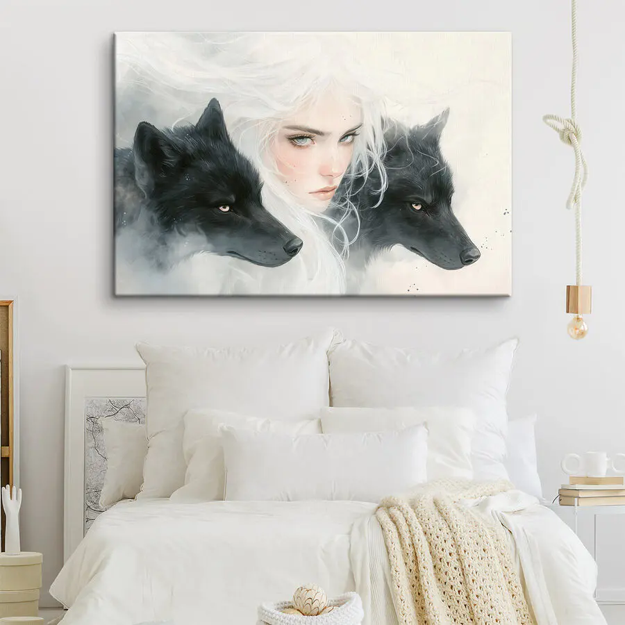 Transformez votre espace avec cette superbe impression sur toile représentant une femme aux cheveux blancs flottants flanquée de deux loups intrigants. C'est comme si vous aviez un morceau de magie sauvage sur votre mur. Imaginez que vous passiez devant cette œuvre d'art et que vous ressentiez un changement d'ambiance instantané - c'est mystérieux, un peu éthéré, et c'est certainement un sujet de conversation. Les loups semblent veiller sur vous, ajoutant une couche d'intrigue. Parfait pour ceux qui apprécient une touche de nature dans leur décor. C'est plus qu'une simple impression, c'est une pièce qui suscite l'imagination et l'émerveillement, invitant histoires et rêveries dans n'importe quelle pièce. Qui n'en voudrait pas ?