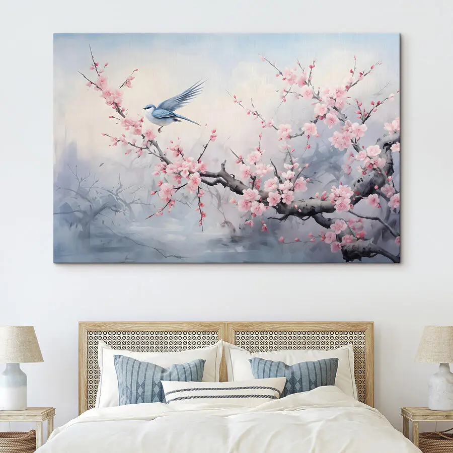 Tableaux Oiseau sur une branche avec des fleurs roses