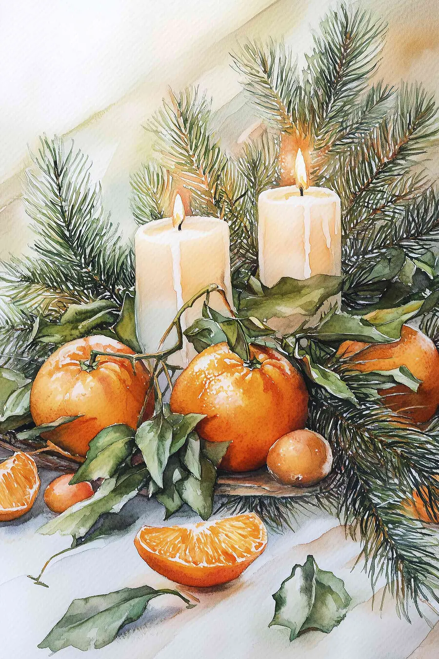 Tableaux Aquarelle d’oranges et de bougies sur une table