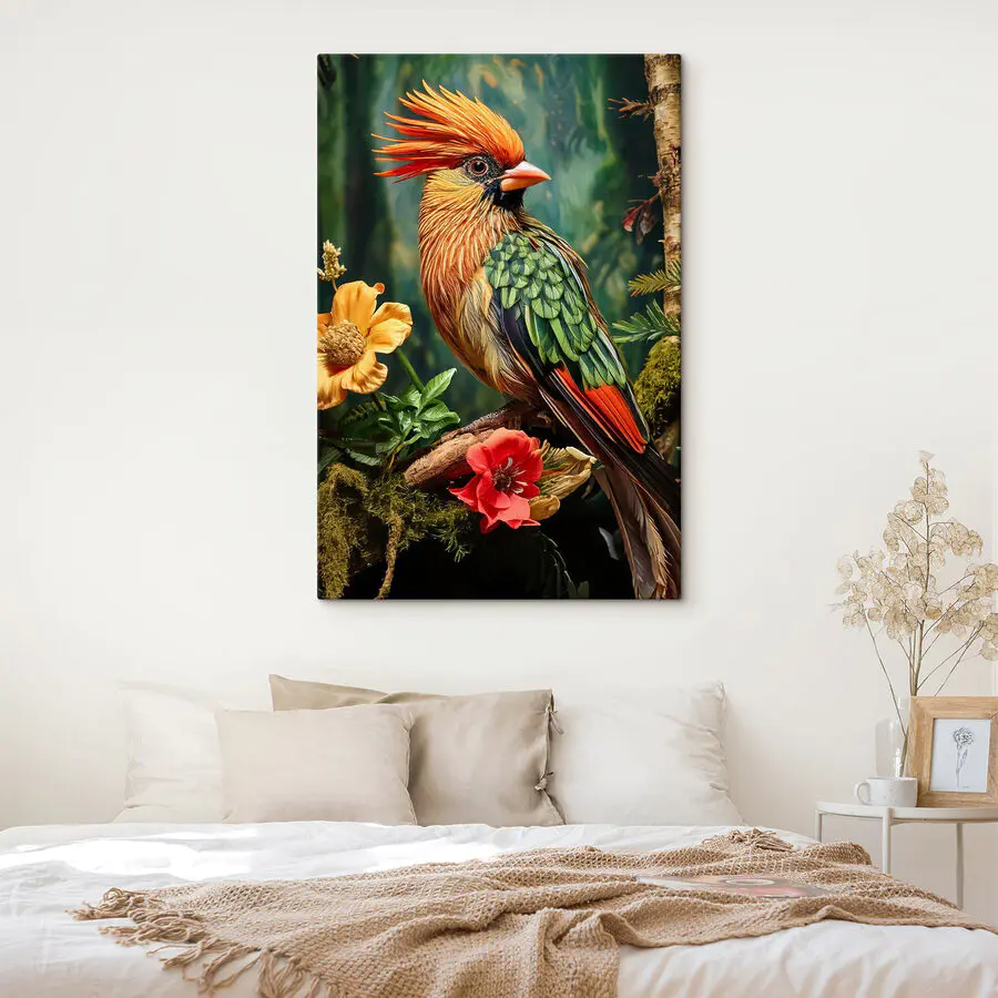 Tableaux Oiseau coloré assis sur une branche avec des fleurs