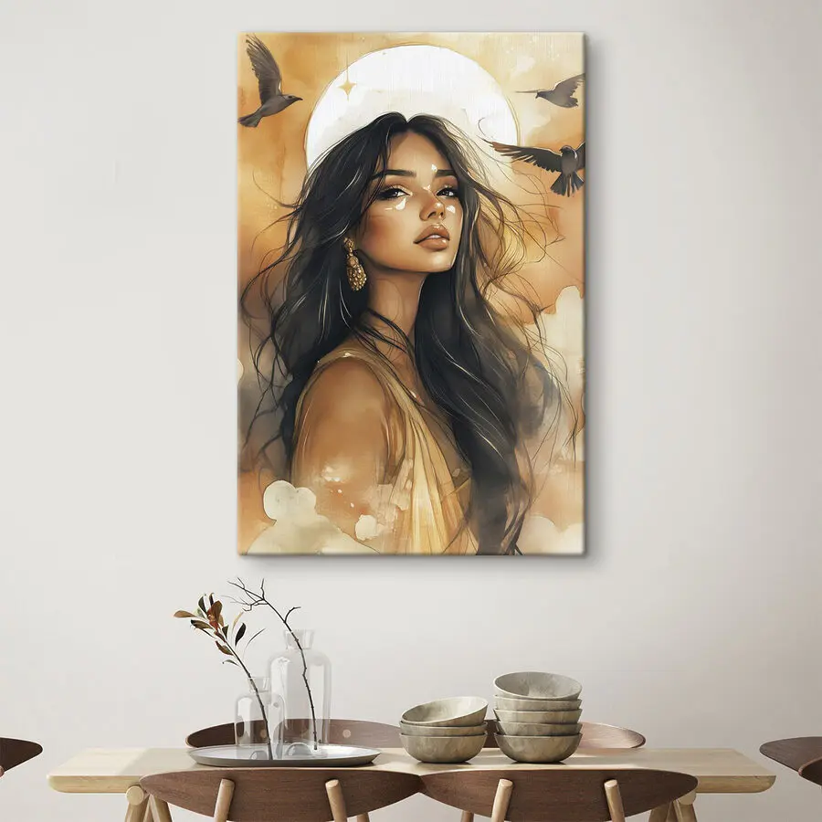 Tableaux Femme aux cheveux longs et oiseau volant dans le ciel