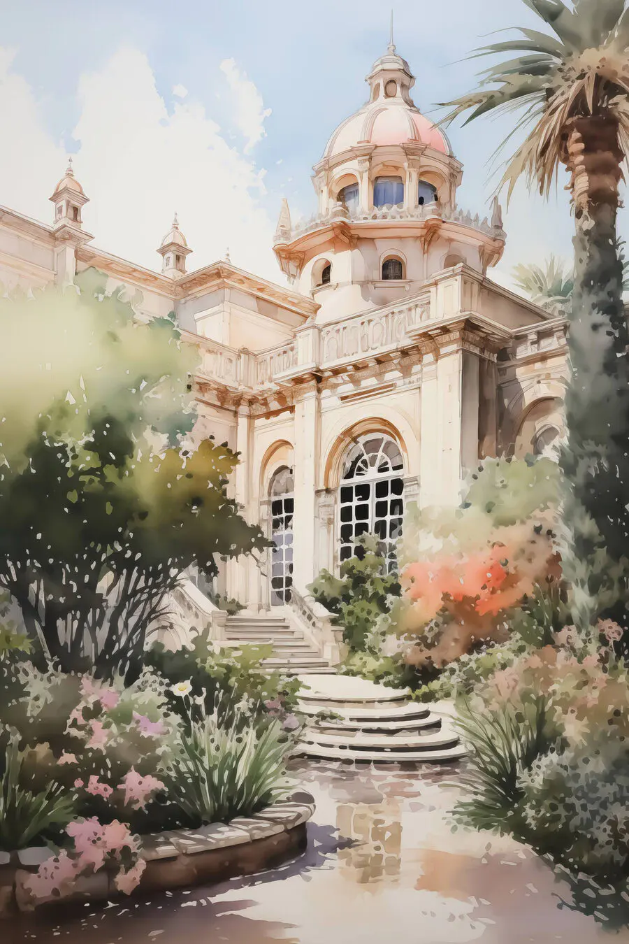Tableaux Aquarelle d’un bâtiment avec une tour et des escaliers