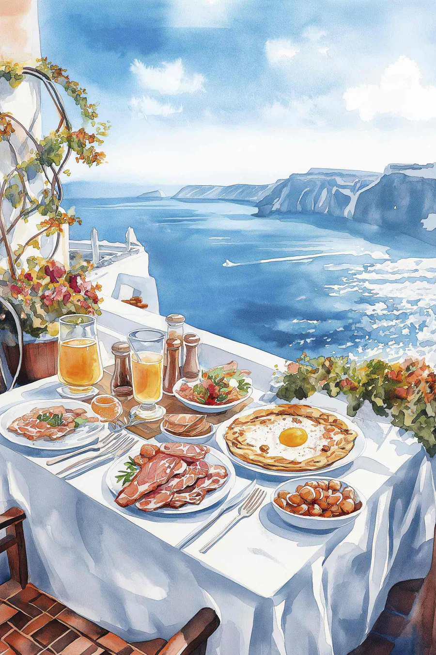 Tableaux Aquarelle représentant de la nourriture sur une table surplombant un plan d’eau