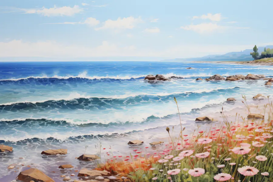 Tableaux Peinture d’une plage avec des fleurs et des vagues