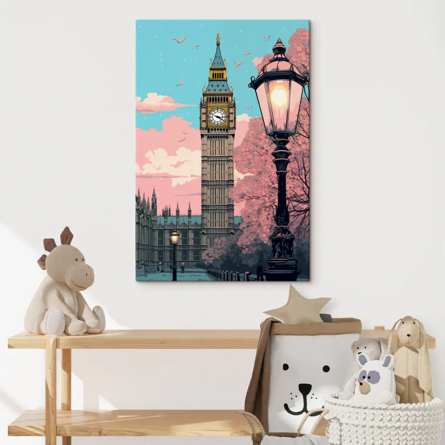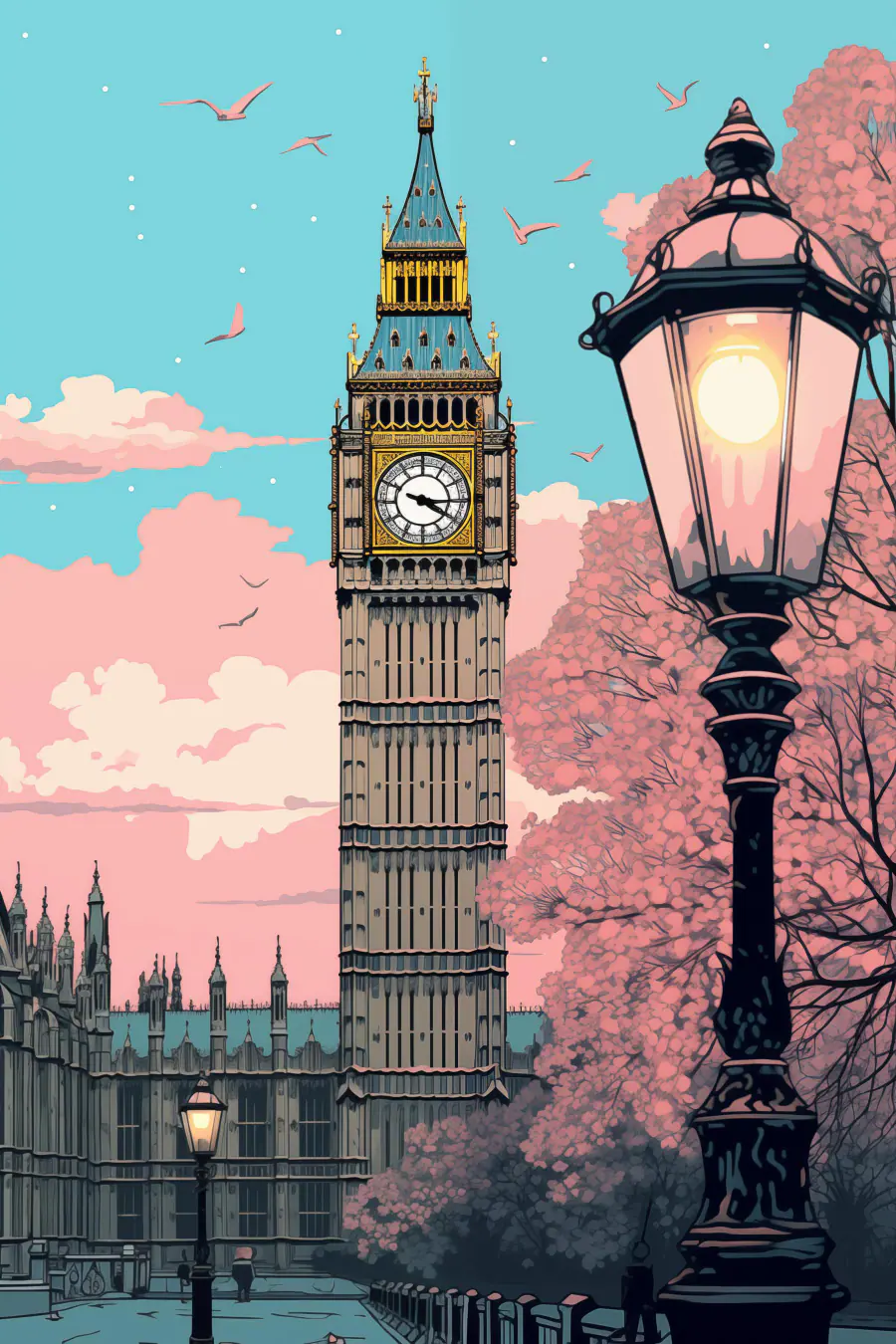 Tableaux Tour d’horloge avec un lampadaire et des arbres