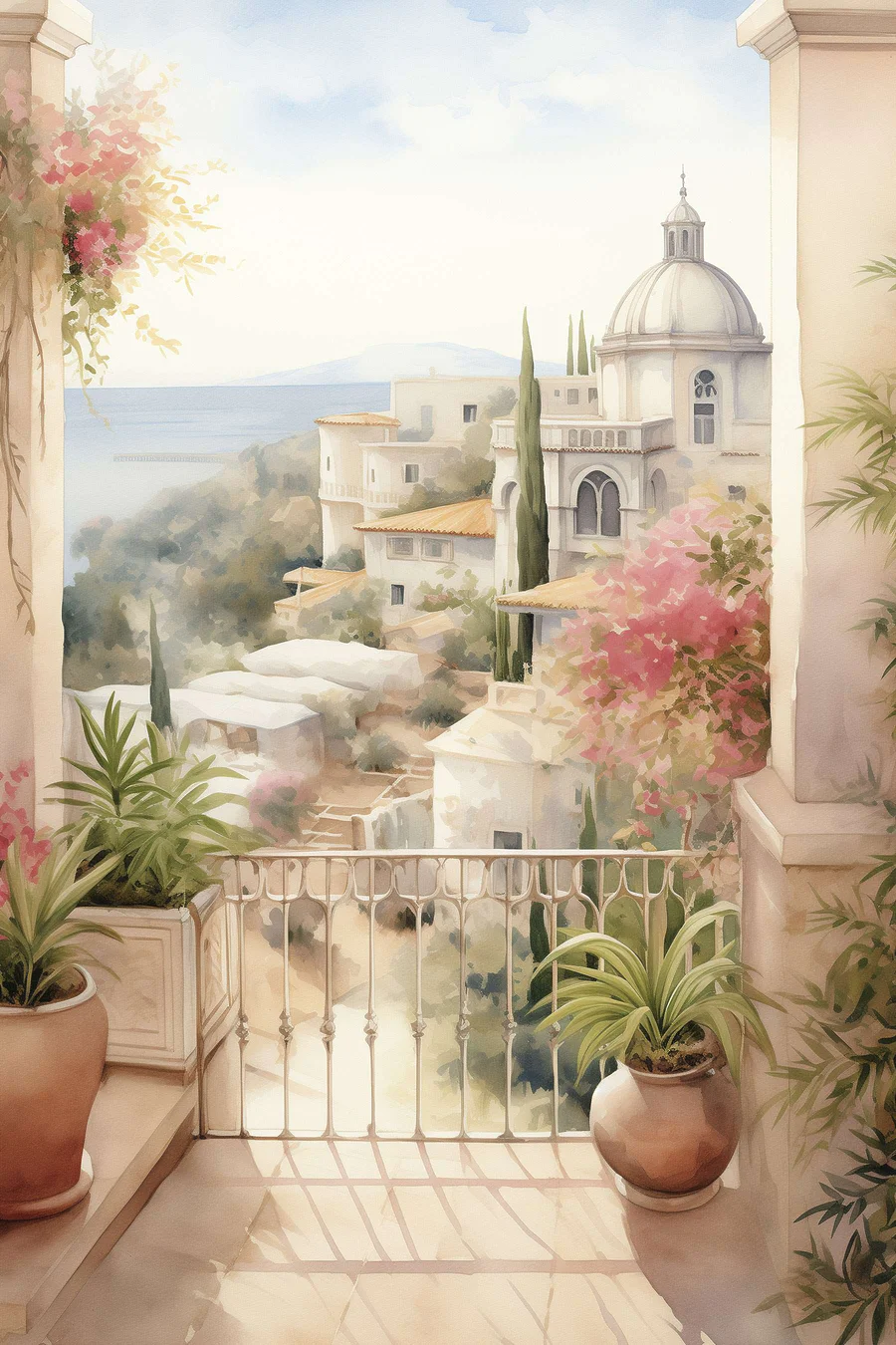 Tableaux Aquarelle d’un balcon avec vue sur une ville